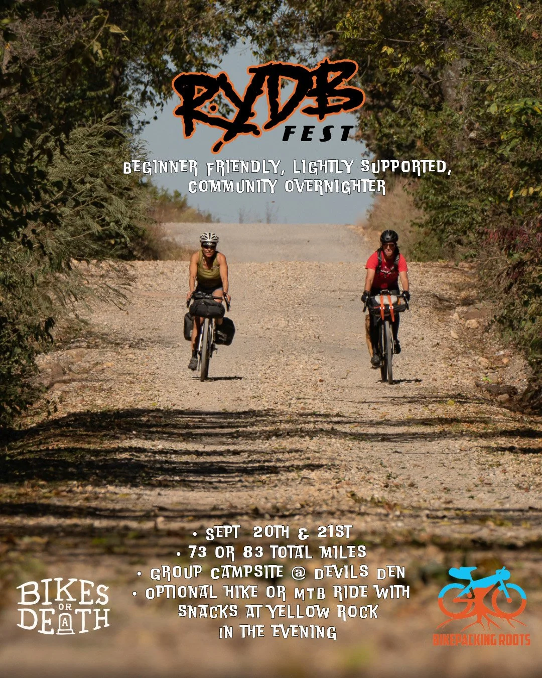 This is a beginner friendly focused ride, but everyone is welcome to come ride with us at a chill pace. We will have ride leaders and sweepers, mechanics on the ride to help with any mechanicals, and a sag vehicle that can assist with carrying gear and/or you and your bike to camp if needed. We also have a Carry My Damn Gear option for riders who don’t want to be lugged down by the additional weight or don't have bikepacking bags yet. Moral of the story, if you wanna ride your damn bike, but you’re not sure if this route is obtainable for you, we invite you to push your limits with the assurance that we got your back. One way or another we’re gonna get you and your gear to camp!